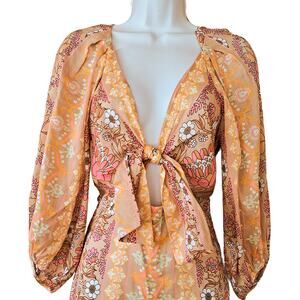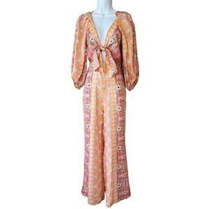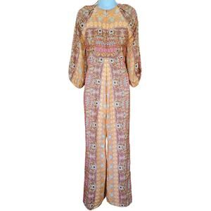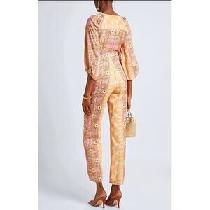 SANDRO Dieppe Printed Wide Leg Jumpsuit Size 36/4 Tan Retro Floral Cutout Plunge