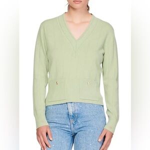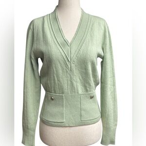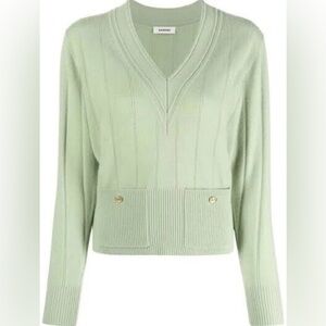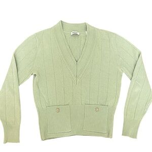 Long-sleeved knitted V-neck sweater featuring 2 patch pockets with gold buttons. EU size 1 equivalent to US size small or size 2-4