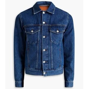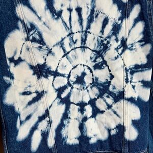 This is a unisex denim jacket by Sandro, with tie die back. Features button-up front. Classic blue denim style. Cool oh so cool.