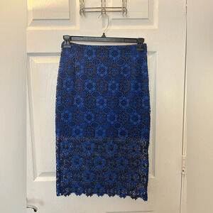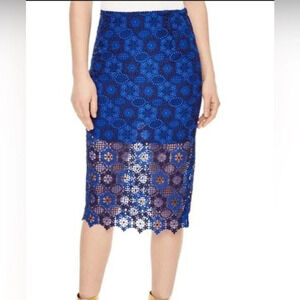 SANDRO LACE-JACQUARD SKIRT size 2 Blue lace jacquard skirt from Sandro. Featuring a high waist, side zip fastening, side slit details, a lace jacquard design, a scalloped hem and a midi length. This item is women's clothing.