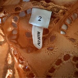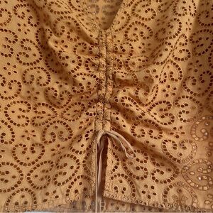 Sandro Livio Broderie Anglaise Top. This eye-catching top showcases the renowned Parisian brand's exceptional craftsmanship and style. The burnt orange color and eyelet detailing make a unique and fashionable statement.Designed with a drawstring cinched front, this top offers a flattering and adjustable fit and invisible side zipper. Please note that the tank featured in the images is for styling purposes only and is not included with the top.