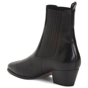 pull on loop, goring panels for stretch, stacked block heel, leather lining
