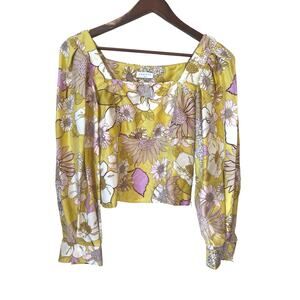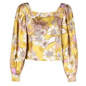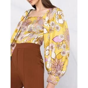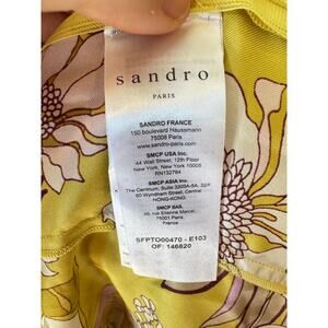 SANDRO NWT Ginger Blouse Yellow Green Size 0 Floral Print Silk Twill Square Neck