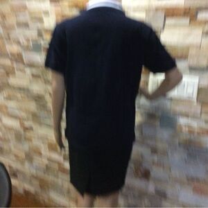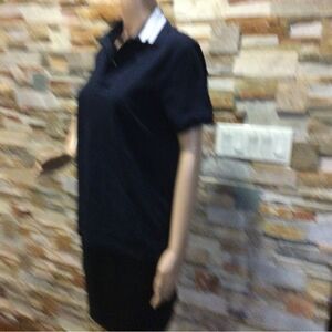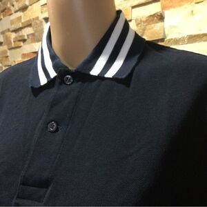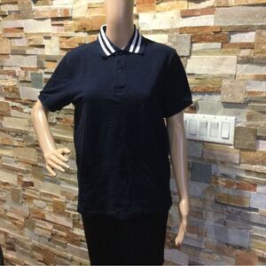 Stylish navy polo shirt featuring a white striped collar. Perfect for casual wear. 100% cotton. Good condition. Pit to pit 19.5 inches.