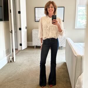CONDITION Excellent. This was worn once. The only thing to note is there is a small pink or red thread that during the manufacturing process got inadvertently sewn inside the button placket. That is how it came. It isn't noticeable when wearing the top. Please refer to the photos.