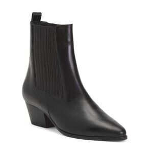 stacked block heel, stretch side panels, lightly padded footbed, pull on loop, size chart conversion may vary slightly by country, leather lining