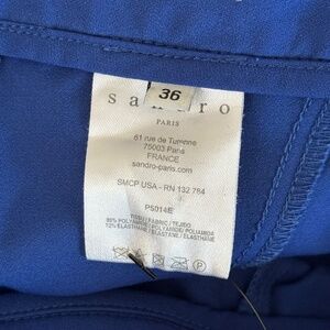 Sandro cobalt blue trousers. Zipper detail at ankles. P5014E. 80% Polyamide 20% Elasthane. Front zipper and hook and eye closure. Belt loops. Decorative front and back seams. Bought from The Real Real but never worn. Size 36