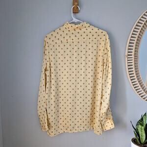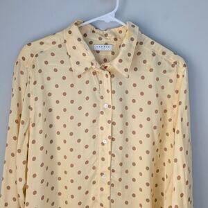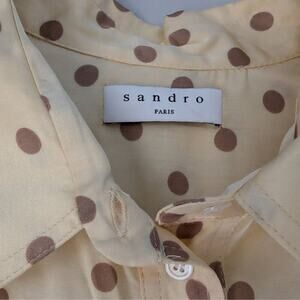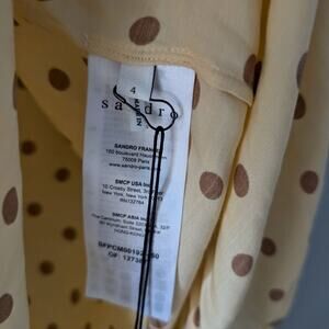 This is a beautiful Sandro Paris Peany shirt in polka-dot print. Yellow, button-down. Silky satin material, 100 % viscose. Mother-of-pearl buttons. Sandro size 4, which according to their size chart is US size 10. New with tags.