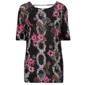 This gorgeous women's top from Sandro is crafted from a soft, lightweight viscose jersey fabric in black. It features a beautiful climbing floral design, tailored in a chic, relaxed fitting style. It is finished with short sleeves, a round scoop neckline and plunging open detail at the back.