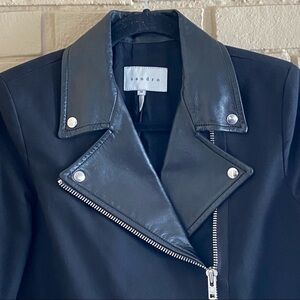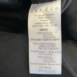 SANDRO Paris Zipped Biker Moto Lamb Leather / Cotton Jacket Size 38 US 6 8. Excellent condition with no flaws. Stunning piece with buttery lamb leather accents and collar. Thick cotton knit and structured look. See measurements in pictures.