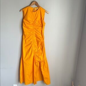 Modern cinching lends distinctive detail to a bold midi dress that brings sunshine vibes wherever you go. Crewneck Sleeveless Lined 97% cotton, 3% elastane Machine wash, line dry Imported Worn once Excellent condition Retails $445 Size 38