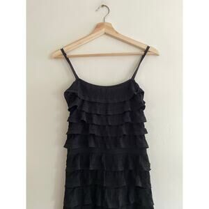 Elevate your evening wardrobe with the Sandro Black Ruched Tiered Mini Dress. This sleeveless sheath dress features a chic spaghetti strap neckline and a ruched, tiered design that adds texture and sophistication. Perfect for cocktail parties or a night out, its classic black hue ensures versatility and timeless elegance.