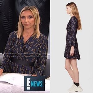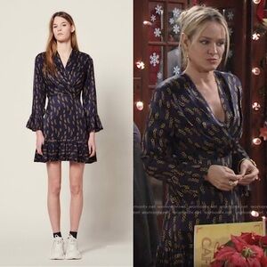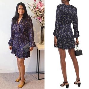 SANDRO Silk Satin Chain Print Draped V-Neck Long Bell Sleeve Ruffle Hem Dress XS