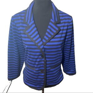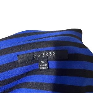 With this Sandro blazer you can go from the office to dinner with ease. A blazer you can dress up or down! Blazer is black and blue striped and has faux pockets. Make sure to get a trendy look with this blazer! Size extra large.