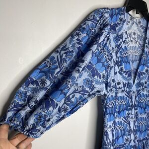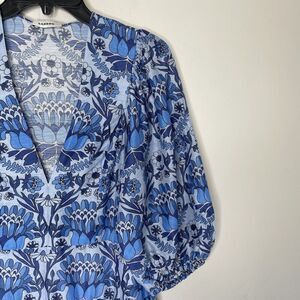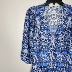 SANDRO Yana Dress Womens 38 Medium Blue Floral Linen Blend Mini Ruffle V-Neck