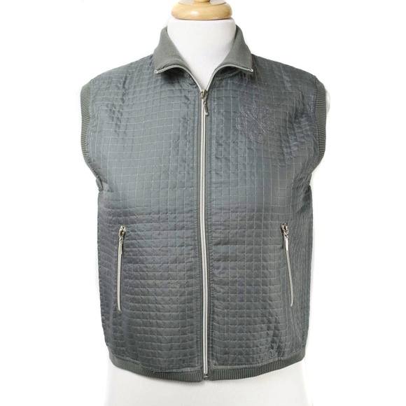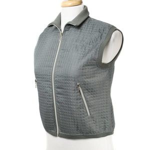 Sandy Elliott bluish-green-gray quilted full zip light weight golf/active/casual vest. Ribbed knit trim. 2 front zip pockets. Embroidered flower on the front.