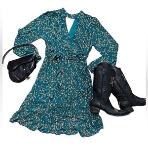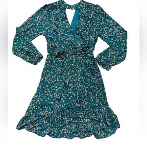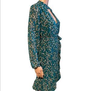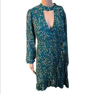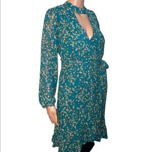 Gorgeous floral wrap double key hole dress. Buttons at back and has open key holes. No holes or stains. Super lightweight and comfortable. Wraps at waist. Box- L