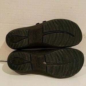 Ladies Sanita liquid gel black leather mules/ clogs. The clogs are in good condition. There is a double strap across the top of the foot.