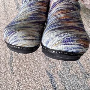 EUC Beautiful brown leather trimmed fabric clogs that are reminiscent of Vincent Van Gogh's Starry Night painting, from Sanita, the original Danish clogs. Clog uppers are leather and suede lined, except in the toe area. Bottoms are wood, with leather name patch at heel. Rubber tread soles help prevent slipping.