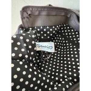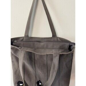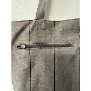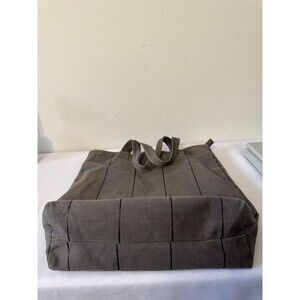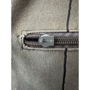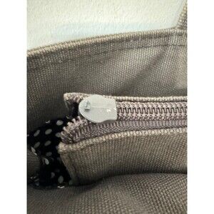 In great condition minus 2 zipper pulls that are missing. One on top of tote and one on back zip. Please see pics-doesn't affect the zippers at all. This dark gray canvas tote bag is a rare find.