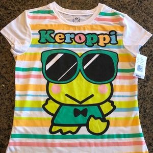 For any KEROPPI or SANRIO FAN. Little girls will love this tee with the large graphic design of Keroppi and his cool green glittery glasses. The Keroppi lettering is also enhanced with cute subtle glitter. Every little girl loves a little bling.