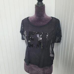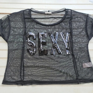 SANS SOUCI Sexy SEQUIN Black Net PARTY COCKTAIL WOMEN'S Sheer Cropped Top Sz S
