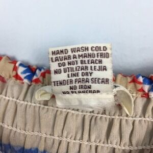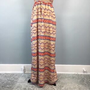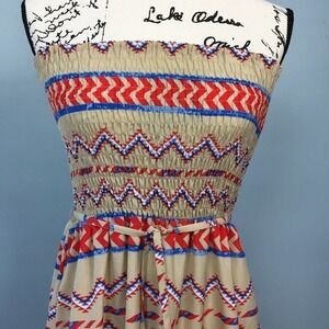 Tan with red-orange and blue Aztec tribal pattern of light and breezy 100% polyester fabric. Elastic Shirring top, strapless, attached self tie belt. Hand wash cold. In excellent, pre-owned condition. Measurements taken flat: armpit to armpit (and waist) unstretched: 13", stretched: 21", hips: 22", length from neckline to hem: 50.5".