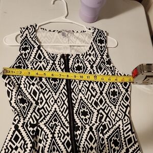 Stylish dress with a bold black and white geometric pattern. Perfect for any occasion.