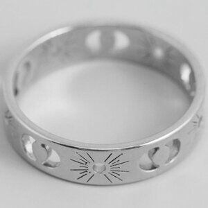 Elevate your look with this brass ring featuring celestial sun and moon cut outs. Designed in a size 7.5, its polished golden finish adds a touch of boho charm and cosmic allure to your style, making it a unique statement piece for any jewelry collection.