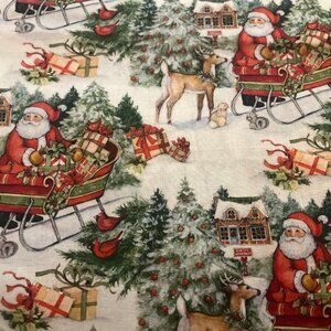 Fabric has SANTA'S SLEIGH with PRESENTS and his REINDEER on a WINTER WHITE background.