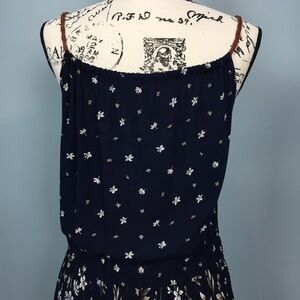 Lightweight floral print on 100% viscose sleeveless mini dress. Navy floral in tan, olive gree, cream. Wash by hand.