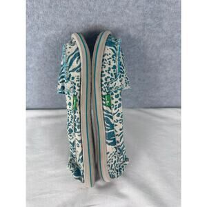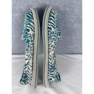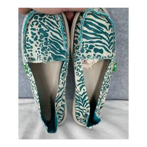 SANUK Woman's sz 7 Canvas Slip On Beach Summer Shoes Animal Print Surfer Teal
