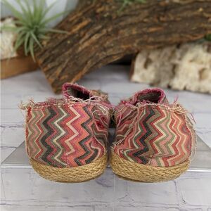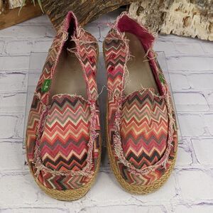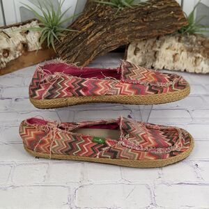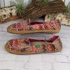The Funky Fiona by Sanuk is a comfortable shoe with attitude. These adorable slip-ons feature a frayed mock toe and a vibrant Chevron print that will surely make your summertime wardrobe pop. You will love how cushy and comfortable they are when you're wearing them. They have a High Rebound molded EVA footbed. Thanks to the AEGIS antimicrobial technology there won't be any funky odors. The Happy U Rubber outsole will provide you with excellent traction and durability so you can wear your Funky Fionas for many seasons. Great for surfing the sidewalk or shopping with the girls, Sanuk's Funky Fiona Shoes are stylish and fun. Imported.