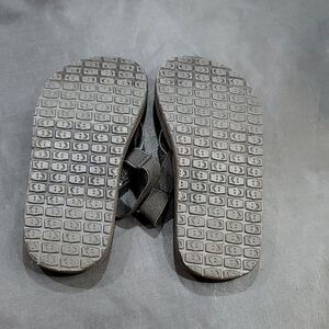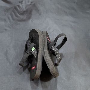 SANUK GIRL YOGA GLITTER STRAP SANDAL K7-8 COLOR BLACK Sanuk Girls' Yoga Glitter Flip Flop (Big Kid)Features Synthetic glitter strap with soft webbing toe post and soft jersey lining Footbed made from real yoga mat Happy U sponge rubber outsole back elastic straps THIS ITEMS IS PRE-OWNED EXCELLENT CONDITION WITH ONLY LIGHT SIGNS OF WEAR IF ANY CHECK THE PICTURES