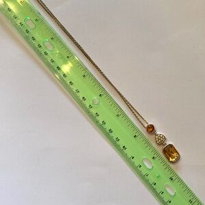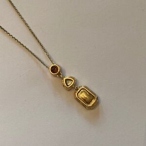 Amber color and white crystal pendant in goldtone setting with goldtone chain. Nicely finished pendant back. Total length of necklace is 19", but with added extension chain, extends up to 21" length. SAQ made jewelry for Avon.