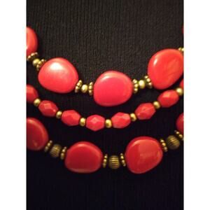 SAQ Necklace Red Three Strands Plastic Beads Light Bronze Chain And Spacers