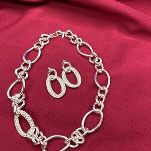 SAQ set: silver-tone chain link choker necklace w/ crystal accents on one open link, measuring 16 ½” long with lobster-claw closure. The matching post dangle earrings are adorned with sparkly pave clear crystals, measuring total drop length 1 ½ ”. In very good pre-owned condition.