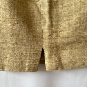 Size 6, 100% raw silk, gold, pencil silhouette, back zipper and back slit at knee, knee length, fully lined.