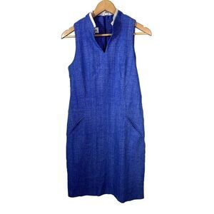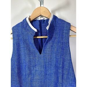 Slip on with concealed back zip closure. V-neck. Stand up collar with accordian pleat trim. Sleeveless. Two front pockets. Blue and white nubby textured stretch fabric. White trim. Stretch material. No liner. Resort. Snowbird. Preppy. Classic. Timeless. Sophisticated.