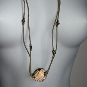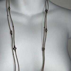 Taupe colored double cord with amber colored hem, small silver bead embellishment spaces throughout, clasp closure. Slight tarnishing in chain extender.