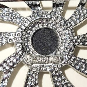 The openwork pin measures 2 1/2" across; the back is marked "SARAH COV". The earrings are 1 1/2" across; the clips are marked "SARAH COV" & "PAT. PEND.".