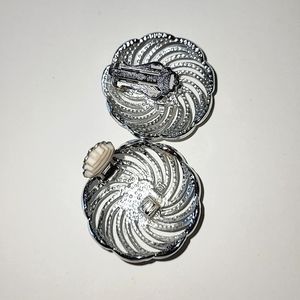 Stylish silvertone brooch with matching clip-on earrings by Sarah Coventry, called "Mystic Swirl", from 1966.