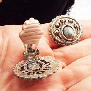 SARAH COVENTRY PAT. PEND. SILVERY FAUX TURQUOISE OVAL CAB CLIP EARRINGS 60