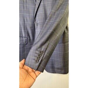 This is a Sartoria Partenopea Napoli men's sport coat in size 54L. The jacket is made of wool in a navy check pattern, featuring a four-button sleeve style, notch lapel, and two-button front closure. It is suitable for business occasions and comes from Italy. The classic design is perfect for various seasons and occasions like weddings or work. Chest 43 in. Shoulder to shoulder 17.5 in. Length 32 in. Sleeves 27 in. Cuff opening 5.5 in. Length across the bottom 21 in.