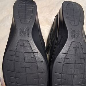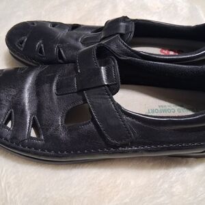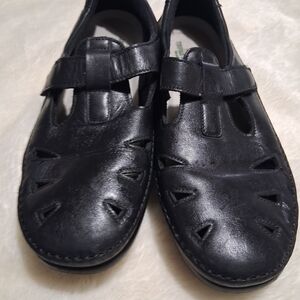 These SAS black sandals are crafted for ultimate comfort, featuring a cushioned sole and a convenient velcro strap for easy adjustment. The elegant cutout design in the leather adds a stylish touch, making them perfect for everyday wear.