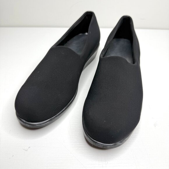 Retails for $149 Model: Bliss Size: US 9.5 M Color: black Closure: slip on Toe: almond Heel: approx. 1.5" Platform: approx. 0.5" Upper: stretch fabric Insole: leather, Tripad cushioning, removable Outsole: man made Details: designed to fit and follow the shape of your foot, SAS Tripad technology gives long-lasting comfort, shock-absorption, flexible Minor cosmetic blemish from normal wear (see photos for reference) No tears, no holes, in great condition