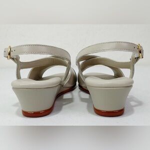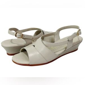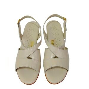 These cream sandals by SAS feature a minimalist design with a comfortable low wedge heel, perfect for everyday wear. The peep-toe front and adjustable slingback strap ensure a secure fit, while the natural-colored sole adds a touch of elegance. Ideal for summer outings, these sandals combine style and comfort effortlessly.