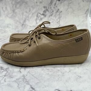 SAS, Granny core Shoes. Leather Uppers. Size 8Narrow. Excellent condition! These tan flats boast a soft suede finish and a timeless moccasin design, complete with visible stitching. The matching tan laces tied in a bow add a touch of sophistication to their casual charm.