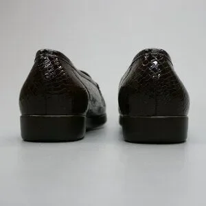 A pair of SAS Simplify brown patent leather crocodile embossed moccasin toe slip-on loafers tri-pad comfort shoes made in the USA