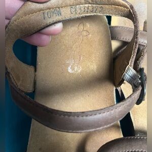 These comfortable dress sandals feature genuine leather straps and a wood grain patterned base that's sure to turn heads. A soft contoured insole covered in Super Suede supports the natural arch of the foot, and a flexible sole rebounds with each step. The fit of this sandal is customizable with two adjustable buckles. Made In The USA